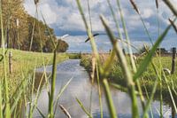 Oude Nederlandse Zeedijk dichtbij Hanzestad Kampen. Uitzicht op de polders en graslanden langs de randen en hellingen van de dijk. Typisch Nederlands landschap met fris groen lentegras een sloot en weilanden. Stapelwolken drijven over het Hollandse landschap.
