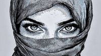 Een vrouw met intens blauwe ogen kijkt de kijker recht aan. Haar gezicht wordt gedeeltelijk bedekt door een hoofddoek, wat haar uitdrukking mysterieus en fascinerend maakt. De illustratie is uitgevoerd in een blauwgrijze arceerstijl, die de scène diepte en structuur geeft en tegelijkertijd een sfeervolle, bijna koele stemming creëert.