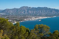 In de verte zie je de kustplaats Altea met zijn jachthaven, die aan de voet van de Sierra de Bernia ligt. De opvallende bergketen domineert het kustlandschap. De zee wordt omlijst door de groene boomtoppen van de pijnbomen en de witte huizen van de toeristische kust. Deze foto zou het berglandschap van de Middellandse Zeekust bij je thuis moeten brengen en een reislust moeten opwekken.