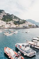 Op de foto zie je op de voorgrond een aantal kleine bootjes die rustig dobberen op het water. Deze bootjes liggen voor anker aan de prachtige en ruige Amalfikust, een van de meest iconische kustlijnen van Italië. Op de achtergrond zie je de plaats Amalfi, die tegen de steile rotsen is gebouwd. De charmante gebouwen van Amalfi lijken bijna tegen de rotsen aan te kleven, wat een indrukwekkend gezicht is.