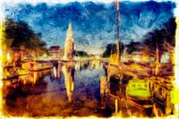 Een expressionistisch schilderij van een nachtelijk uitzicht op Amsterdam. Dit zeer gedetailleerde kunstwerk is een kunstige fusie van analoge en digitale illustraties in de stijl van de klassieke kunst.