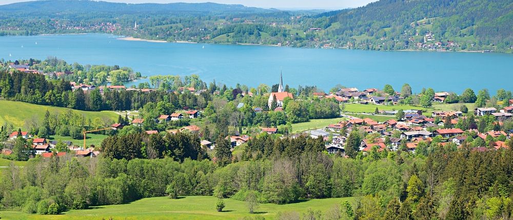 Uitzicht op Bad Wiessee en Tegernsee vanaf de Bucherhang, lentelandschap Beieren