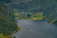 Eén van de grootste fjorden van Noorwegen het Geirangerfjord met in het dal het dorp Geiranger. De foto van het fjord gemaakt in de herfst met de prachtige herfstkleuren.