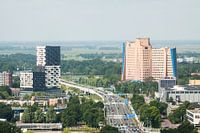 Uitzicht op de Zuidelijke Ringweg in Groningen vanuit het DUO gebouw. Aan de linkerkant is La Liberté zichtbaar met rechts daarvan het Gasunie gebouw. Het Julianaplein is op de voorgrond nog te zien.