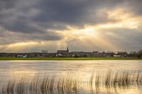 Zicht op Hattam vanaf de IJssel tijdens een bewolkte winterse zonsondergang met zonnestralen vanachter de wolken.