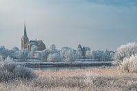 Uitzicht op Kampen en de IJssel in de winter in Nederland. Kampen is een oude Hanzestad in Overijssel. De Bovenkerk is zichtbaar op de voorgrond van de stad.