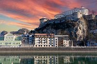 Uitzicht op Kufstein met fort en Inn in Oostenrijk, Tirol, Europese Alpen bij zonsondergang