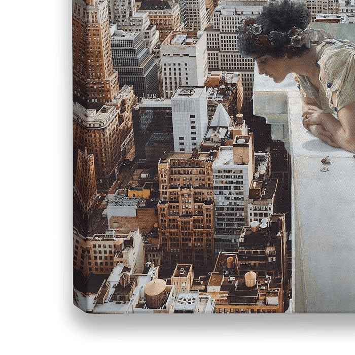 "Manhattan View" is een digitale collage die hedendaagse fotografie combineert met de grootsheid van neoklassieke schilderkunst. In dit werk zijn verschillende mooie vrouwen uit die tijd afgebeeld op de top van een wolkenkrabber, gefascineerd door het duizelingwekkende uitzicht over heel Manhattan. Hun gebaren en uitdrukkingen gaan een…