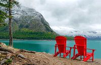 Uitnodigende rode Adirondack stoelen bij Lake Minnewanka in Banff Nationaal Park, in de Rocky Mountains, Alberta, Canada, Noord-Amerika. Lake Minnewanka is een gletsjermeer in het oostelijke deel van Banff National Park in Canada, Het meer is het langste meer in de bergparken van de Canadese Rockies. Banff National Park staat op de…