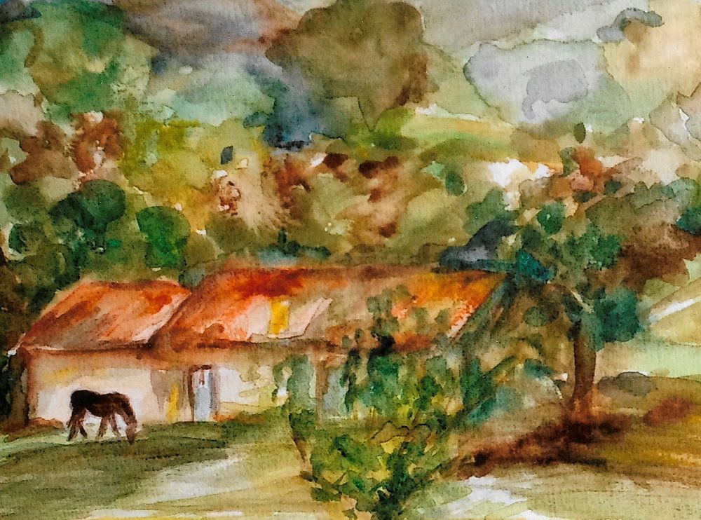Vakantie / Portugal / Algarve / Boerenhuisje / Boerderij / Paard / Bomen / Landschap / Bergen / Aquarel/ Handgeschilderd / Ineke de Rijk
