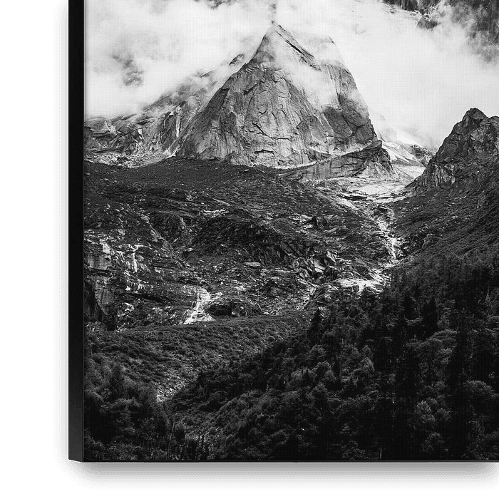 Op de zwart-wit foto is de bergtop van Mount Siguniang te zien, gelegen in de provincie Sichuan in China. De foto richt zich op het detail van de top, die deels verborgen is door laaghangende wolken. De wolken creëren een mysterieus effect. Dit geeft de foto een gevoel van stilte en kracht, alsof de bergen zich langzaam onthullen aan de…