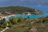 Uitzicht op Samos vanuit Posidonio. Grieks eiland met op de voorgrond groene natuur en op de achtergrond het eiland en blauwe zee waarin bootjes liggen.