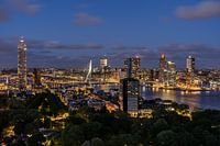 Stel je voor: je kijkt uit over een iconisch stadsgezicht waar moderne architectuur en natuurlijke rust elkaar ontmoeten. In deze adembenemende foto komt alles samen wat Rotterdam zo bijzonder maakt: de trotse Euromast torent boven het groen van Het Park uit, terwijl de elegante Erasmusbrug zich als een lichtsieraad over de Nieuwe Maas uitstrekt. Het diepe kobaltblauw van het blauwe uur omhult de skyline in een zachte gloed, waarbij het stadslicht als sterren op aarde fonkelt.