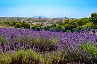Uitzicht op het dorp Valensole met bloeiende lavendelbloemen op het plateau van Valensole in de Provence tijdens een zomerse dag. Dit gebeurt meestal van eind juni tot half juli, afhankelijk van het weer en de hoogte. De lucht is gevuld met geluiden van zoemende bijen en de geur van lavendel doordringt de lucht. In de buurt groeien gouden tarwevelden die voor een kleurrijk contrast zorgen. Lokale producten zijn lavendelolie, zeep, likeur en honing.