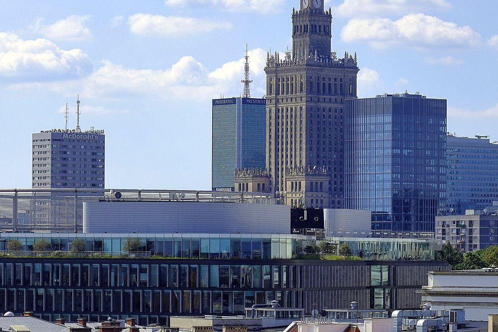 Uitzicht op de oude stadshuizen en het Paleis van Cultuur in de Poolse hoofdstad Warschau.