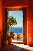 Deze schilderachtige scène vangt het warme mediterrane gevoel met een open deur naar een terras, waar een sinaasappelboom en terracotta potten baden in het zonlicht en uitkijken over de diepe blauwe zee. De warme kleuren en natuurlijke details brengen direct een zomerse, ontspannen sfeer in huis.
