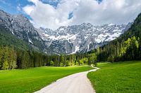 Zgornje Jezersko vallei in Slovenië tijdens een mooie lentedag met de bergketen in de Kamnik-Savinja Alpen.