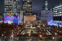 Uitzicht op de watervallen van de 9/11 Memorial waar de Twin Towers stonden, met daarbij ook het Memorial Museum en One World Trade Center.