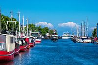 Uitzicht op de Alter Strom met vissersboot in Warnemünde van Rico Ködder
