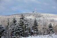 Uitzicht op de Brocken (Harz) met weerstation en Brockenhaus.