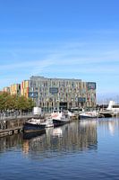 Gezicht op het Nieuwe Stadhuis en de Dender met boten in Aalst, Oost-Vlaanderen, België. Zonnige zomerdag met weerspiegelingen op het water.