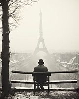 Uitzicht op de Eiffeltoren. Een zwart-wit beeld van een oudere man, zittend op een bankje in Parijs. Kies zelf het formaat en materiaal bij dit werk en maak het helemaal passend voor jouw interieur.