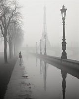 Uitzicht op de Eiffeltoren. Een zwart-wit beeld van een vrouw in de verte, lopend langs het water in Parijs. Kies zelf het formaat en materiaal bij dit werk en maak het helemaal passend voor jouw interieur.