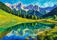 Een adembenemend uitzicht op de Geisleralm, tegen de torenhoge Geisler bergtoppen. De dramatische bergachtergrond wordt perfect weerspiegeld in een kleine, stille vijver, waardoor een verbluffende weerspiegeling ontstaat. De omringende alpenweiden voegen een vleugje groen toe en versterken de serene en schilderachtige sfeer van dit idyllische berglandschap.