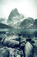 Uitzicht op de Malnessfjord op het Vesteralen eiland in Noorwegen tijdens de winter. Sneeuw valt op de donkere rotsen.