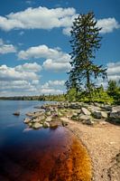 Uitzicht op de Oderteich in de Harz onder een blauwe hemel.