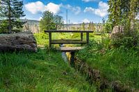 Uitzicht op de Oderteich in de Harz onder een blauwe hemel.