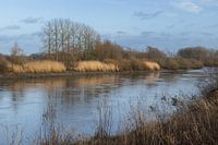Prachtig winterzicht op de Schelde zoals die door het Vlassenbroek stroomt bij Dendermonde en Moerzeke in Oost-Vlaanderen, in België. Goudgele grassen contrasteren prachtig met de lichtblauwe lucht in dit rustige landschap. Prachtige landschapsfoto van het nieuwe Nationaal Park de Scheldevallei in zachte pasteltinten.