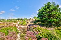 Uitzicht op de Schoorlse duinen. Een naaldboom in close-up en veder bloeiend duinheide. Een mooi natuurgebied vanuit de provincie Noord-Holland.