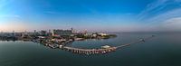 Een prachtig panoramisch beeld van de visserspier in Naklua, volledig in beeld gebracht met een weids uitzicht over de kalme zee. Aan de horizon schittert de indrukwekkende Sanctuary of Truth, omringd door weelderige natuur en moderne hoogbouw van Wongamat. De traditionele vissersboten langs de pier contrasteren mooi met de skyline van Noord-Pattaya, wat dit beeld een perfecte mix van cultuur, traditie en moderne stadselementen maakt. Het ochtendlicht en de heldere blauwe hemel geven de scène een rustige en heldere uitstraling.