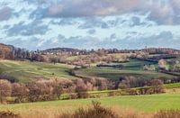 Uitzicht op de Zuid-Limburgse heuvels tijdens de winter van 2021 Je kijkt op de Eyserbosweg met het Eyserbos en in de verte Trintelen en de molen op de Vrouwenheide