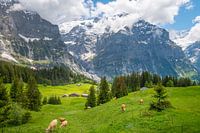 Uitzicht vanaf de berg Schwarzhorn op grazende koeien en de bergen Mattenberg en Eiger, bij Grindelwald, Zwitserland. Bewolkte hemel.