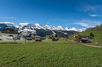 Idyllisch berglandschap met uitzicht op de besneeuwde Churfirsten in de Zwitserse Alpen, Wildhaus-Alt St. Johann, Toggenburg, Kanton St. Gallen, Zwitserland