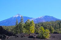 Zicht op de besneeuwde vulkaan Teide op het Canarische eiland Tenerife over endemische Canarische dennen, die groeien in de zwarte lava-as van de vulkaanuitbarsting van 1909.