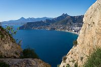 Uitzicht vanaf de top van de Peñón de Ifach richting de blauwe Middellandse Zee en de kust van Calpe. De zuidkant van de berg wordt gekenmerkt door steile kliffen. Geërodeerde rotsformaties omlijsten het kustlandschap. Mediterraans blauw ontmoet het lichtbeige en lichtgrijs van de kalkrotsen.