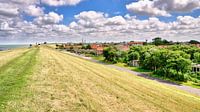 Een uitzicht op de dijk met Den Helder, links van de dijk het Marsdiep en rechts oud Den Helder. Achter in de foto de zeehaven van Den Helder met toevallig de Seafox 7.