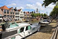 Gezicht op het kanaal Klein Diep en de gebouwen aan het water vanaf de Vleesmarkt in Dokkum in Friesland in Nederland. Zomer stadsgezicht reisfotografie.