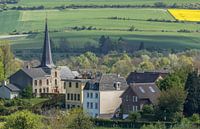 Uitzicht op de H.H. Lambertus en Genovevakerk in Holset tussen de heuvels van Zuid-Limburg