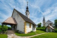 Gezicht op het oeverlandschap en de kerken van Maria Woerth aan de Woerthersee in Oostenrijk