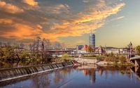 Uitzicht op de skyline van Jena in Thüringen met de rivier de Saale