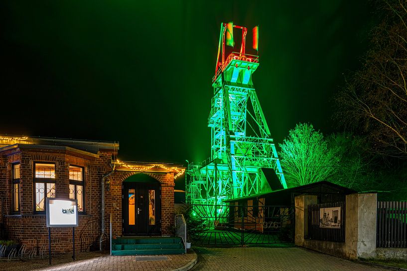 Uitzicht op de slingertoren van de mijn Wettelrode bij Sangerhausen bij nacht tijdens de advent