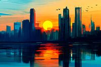 De stralende kleuren van een ondergaande zon worden weerspiegeld in het kalme wateroppervlak, omlijst door majestueuze wolkenkrabbers. Dit levendige stadslandschap met zijn warme gloed en zweem van vrijheid brengt een dynamische energie in de woonkamer en nodigt je uit om te dromen en te blijven hangen. Perfect voor liefhebbers van het stadsleven!