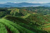 Uitzicht op de uienvelden van Argapura, Majalengka in West Java. Foto genomen in de vroege ochtend na zonsopkomst, met lage bewolking in de bergen in de achtergrond.