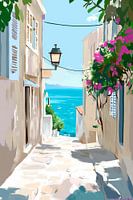 Een uitnodigend pad omzoomd met bloeiende bougainville trekt het oog naar de glinsterende zee. De zachte pastelkleuren en het warme licht creëren een ontspannen sfeer die ideaal is voor de woonkamer. Hier kun je je gedachten de vrije loop laten en genieten van het idee van vakantie en een licht briesje.