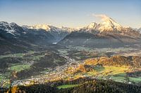 Uitzicht vanaf de Kneifelspitze richting Berchtesgaden met de Watzmann op de achtergrond op een ochtend in het voorjaar.