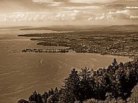 Uitzicht vanaf de top van de Pfänderberg op het Bodenmeer en het landschap van de Oostenrijkse Alpen, sepiatinten